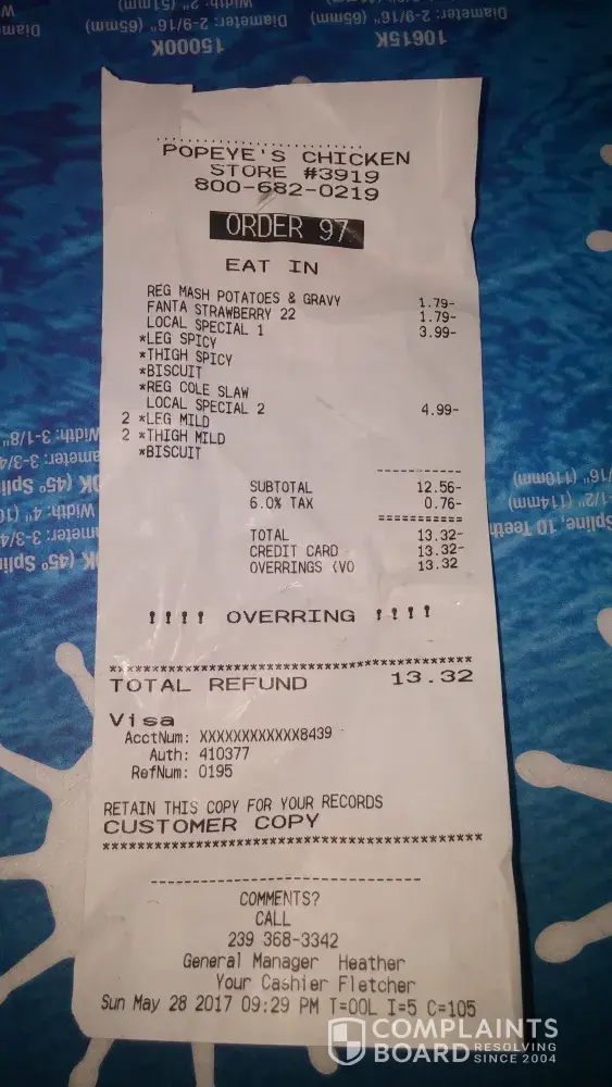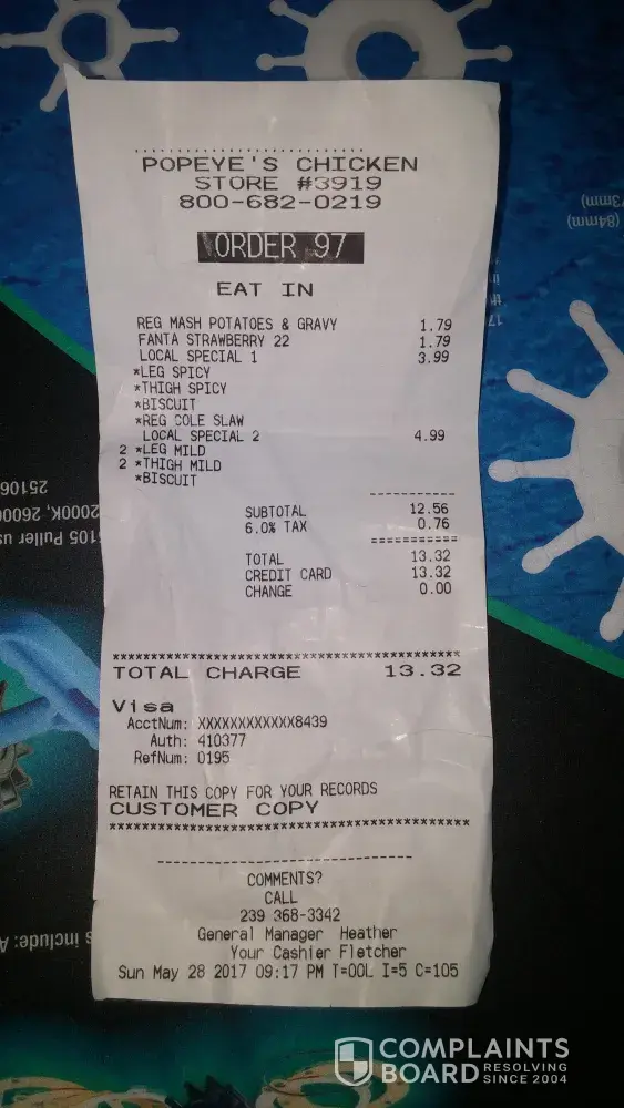 My complaint, I brought the Popeyes chicken back to the 6930 Liberty Rd Baltimore, MD because it was old and dry and not hot. They said wait fifteen minutes they would give me another batch but instead they reheated the chicken and put it in another box. I paid for fresh hot out the fryer not old chicken...it's too expensive to not get what you pay for when you buy out. The store is located on 6930 Liberty Rd Baltimore, MD...3/30/2017 about 4:00pm...we love Popeyes chicken but some stores are giving Popeyes a bad name!