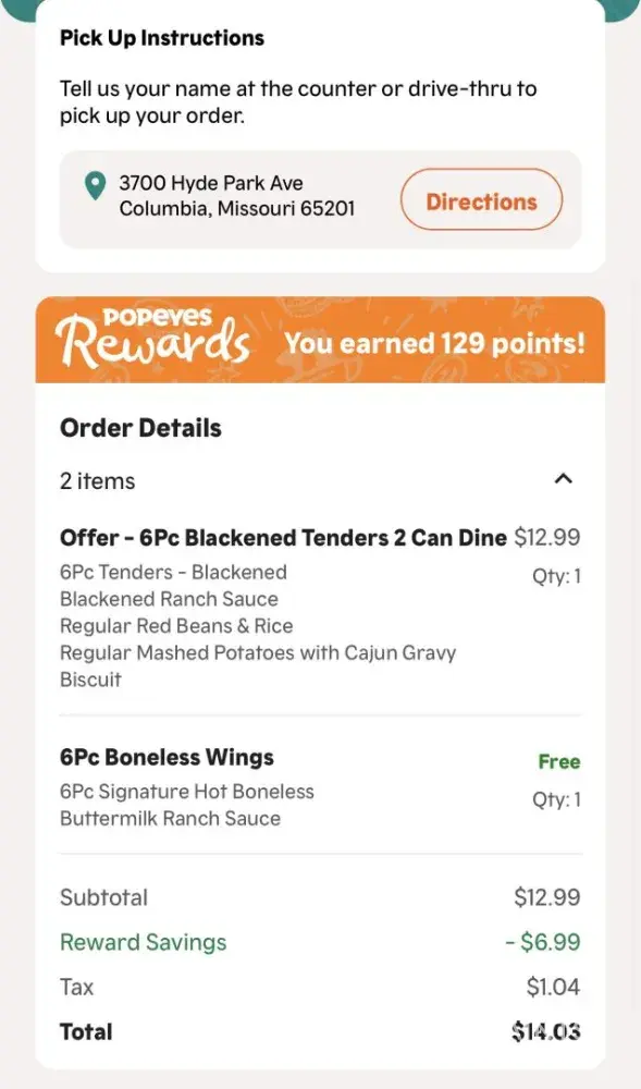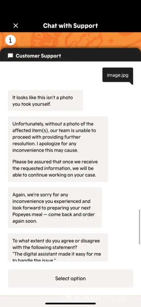 Never received my food. An employee gave me the wrong order, I told them it was wrong and they told me contact support on the app since it’s a mobile order. When I contacted support I was stopped by Popeyes AI chat bot that refused to assist me. Contacted support via email and got no help. I filed a charge back with my credit card.