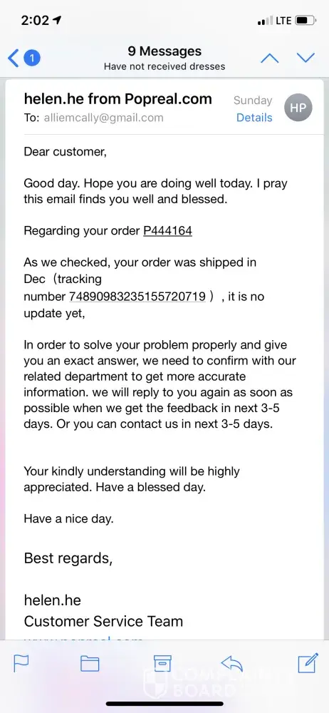 I ordered two items on the 14th of March they told me that my items would arrive 3-5 business days, I can't track my order even though I have a tracking number the tracking hasn't moved nor have I recieve my two items and today is April 4th, I definitely feel like this company is a scam. I have spent over $70 with this company and I want my refund or either my items. Customer service is terrible, you dont actually talk to anyone they will send your msg back to you if you try to email. This Popreal site should be shut down and it is advertising everywhere on social medias.