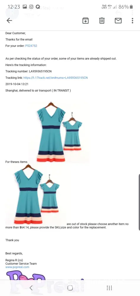 I placed an order that contained 51 items June 2018. Pop real shipped 6 of the 51 items August 2018. In September I began inquiring about remaining missing items. As of January 9 2019 Popreal has not responded. They sent numerous emails to alert me most items were not in stock but still no refund. I have tried contacting them through my financial institution and they provided tracking information for the 6 items and refused to issue a explanation or refund for over $300 worth of never shipped merchandise. I now have to pursue legal dynamics to get my money.