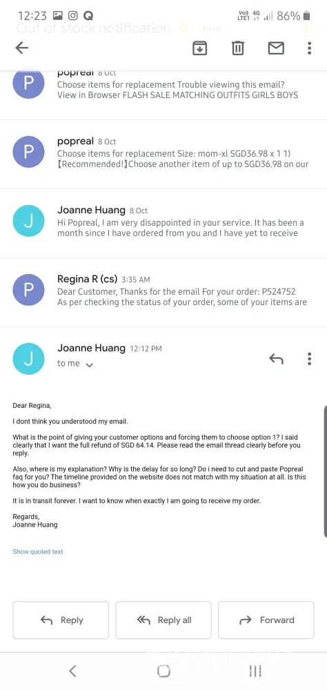 I want proper explanation why the delay, when am i going to receive my 4 pieces of clothes that is transiting forever and when I will get back my refund of SGD 64.14.
