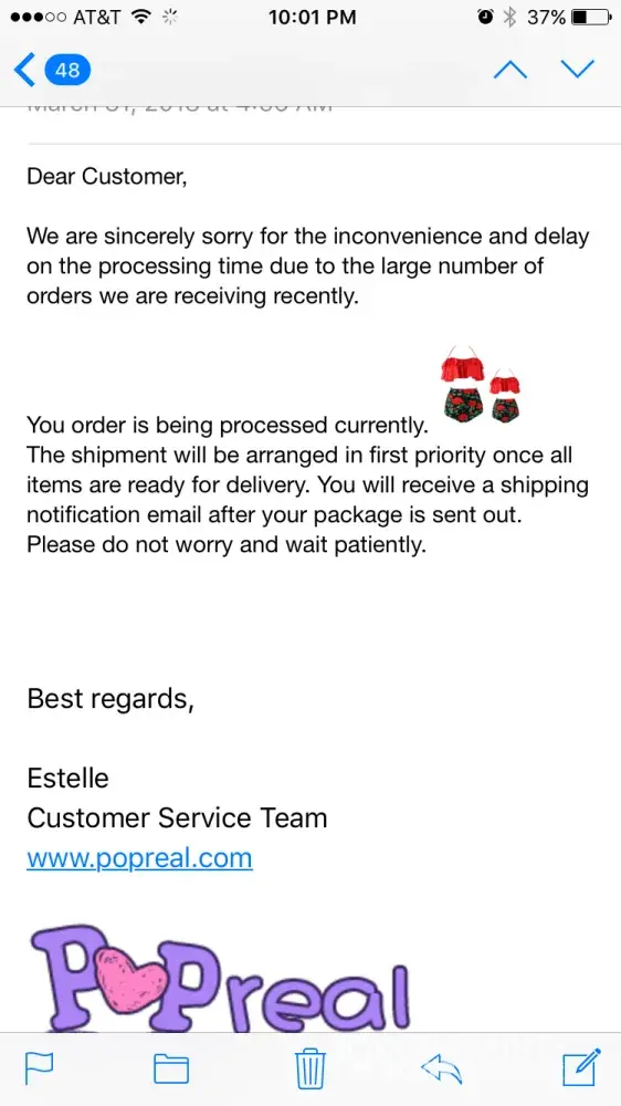 I placed an order some weeks ago. I haven't gotten an email confirmation or a tracking number! i haven't heard from the company since that day i placed my order and they took my damn money. I reached out to them several times asking for a confirmation number of tracking number so i can see what's up with my order. I didn't hear from them so i tried to cancel my order and get my no st back and go shop somewhere else. I still haven't heard from popreal...Haven't gotten my order or my money. My next step is start writing bad reviews and calling the police...The news and better business bureaus! this is ridiculous and inconvenient for me!