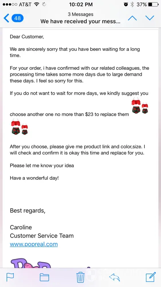 I'm going on vacation and wanted to get a cute bathing suit set for my daughter and mysel. This company was advertised on Facebook. The styles were very cute and inexpensive, so I ordered on March 15 and never received a shipping confirmation even after almost a month. I complained and they apologized for the delays, but still to no avail I had a feeling I would never get my stuff. I canceled and asked for a refund and they told me to choose another item from the website. I just wanted a refund so they said I should see a refund soon. Didn't happen. Finally, I called my credit card company and got my money back.