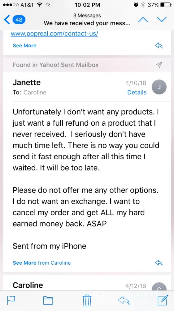 I meant that I did not respond to Popreal, as advised by PayPal.