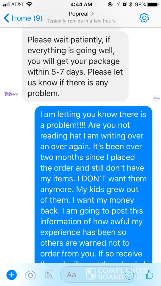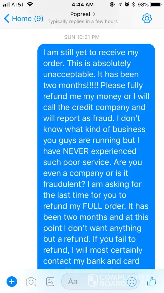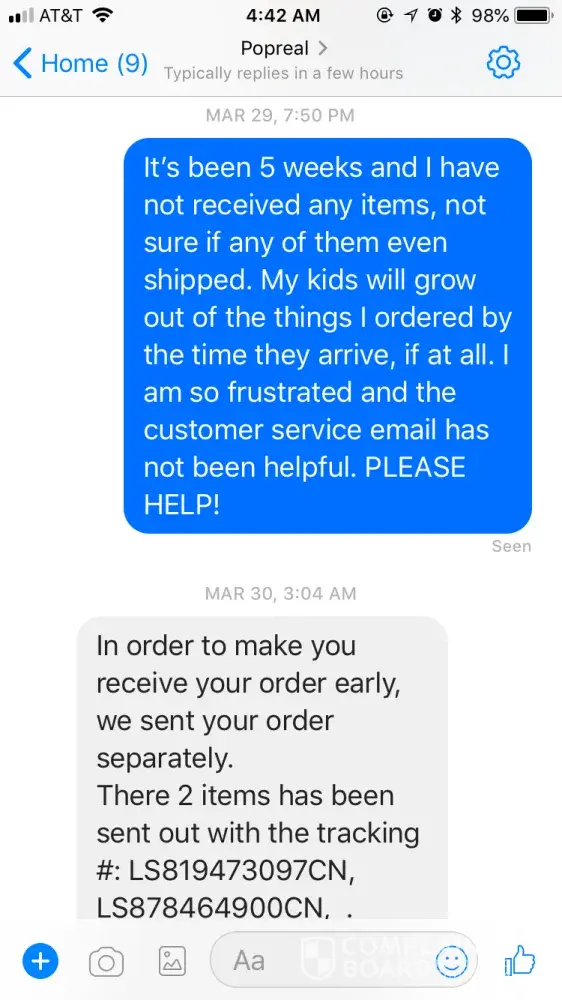 They don't update your order status on the site. (Even now, after receiving items, it shows them as being paid for, but not sent.) I tried calling the number posted on their site-it's only an outgoing message. I emailed multiple times. The two times I did receive a response to my emails 1) I was asked to be patient because two items were on backorder AND that they were slower than usual because of Cineese New Year (mind you the website claims to be in England); 2) then they sent a tracking number that didn't work. In the second response they asked me to stop emailing them. PayPal stepped in threatening Popreal a reversal of charges if I didn't receive my items by a certain time. I received an email asking me to remove my claim so that they "can send the rest." As advised by PayPal, I did resond.