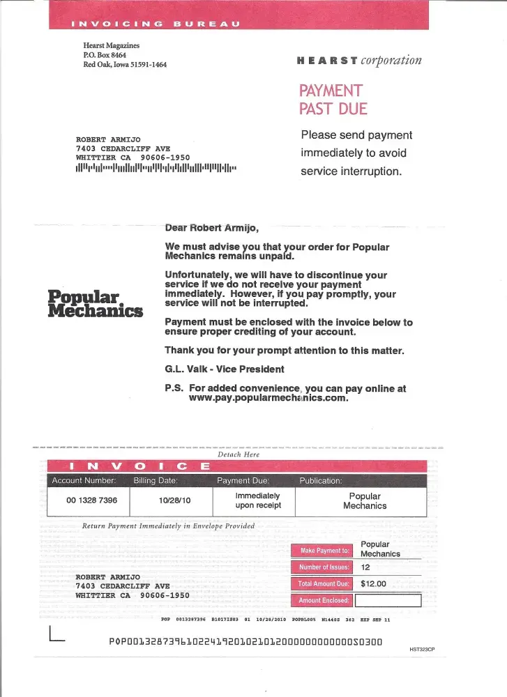 Popular mechanics and hearst should be a trusted magazine publisher. These deceptive past due notices and required continuous subscription are a scam.