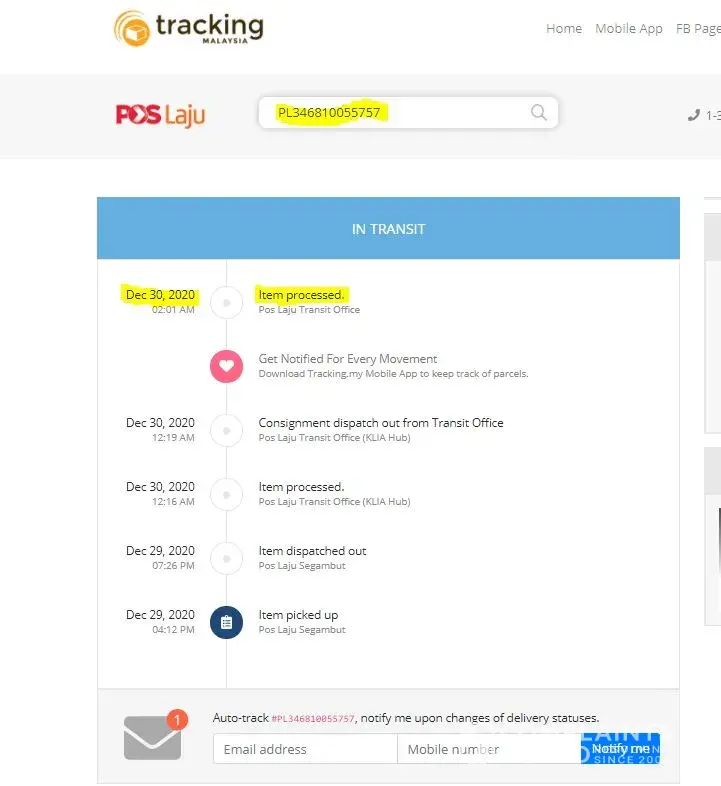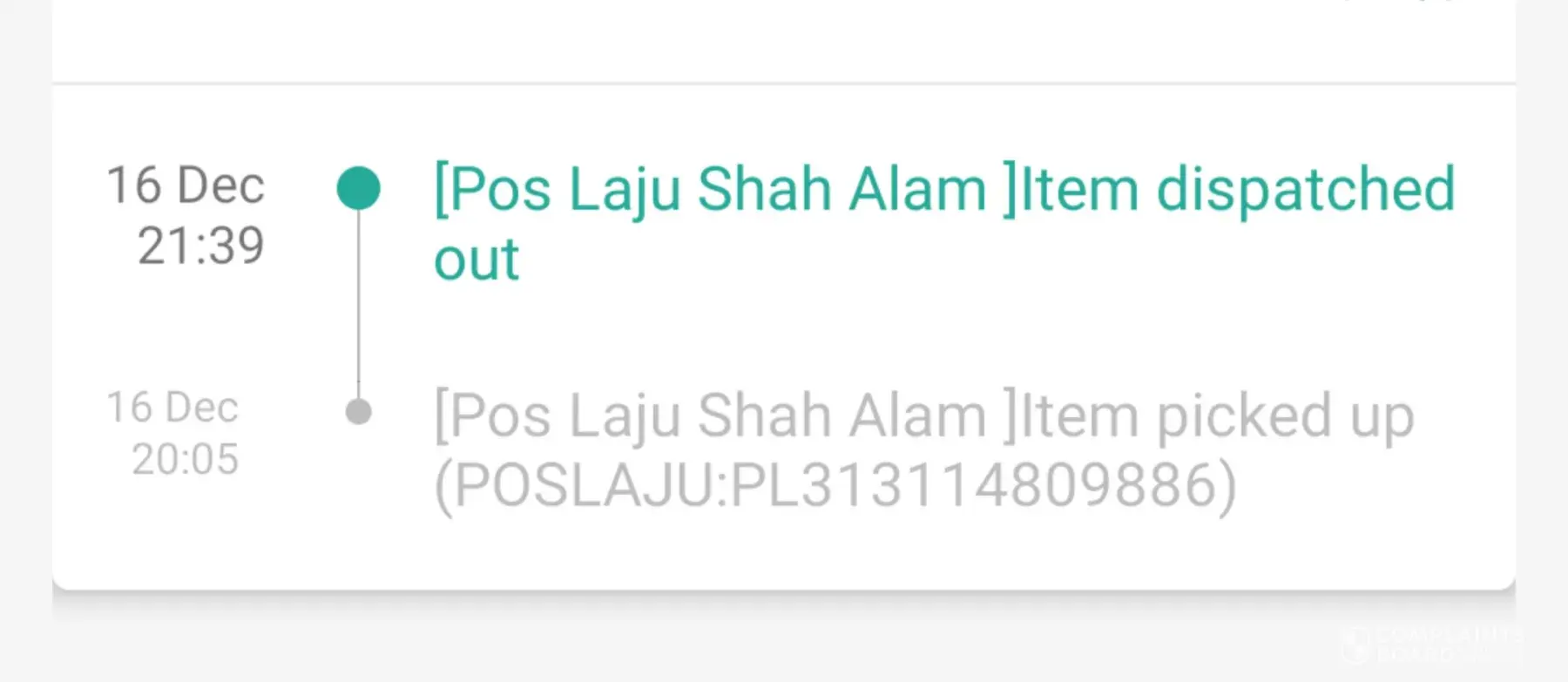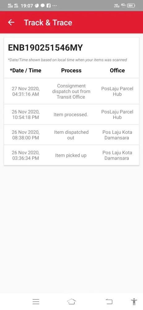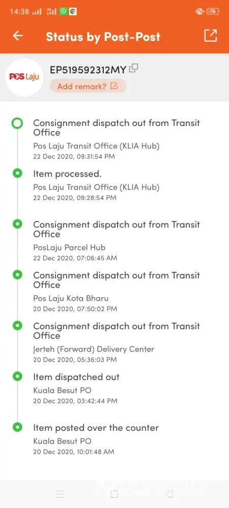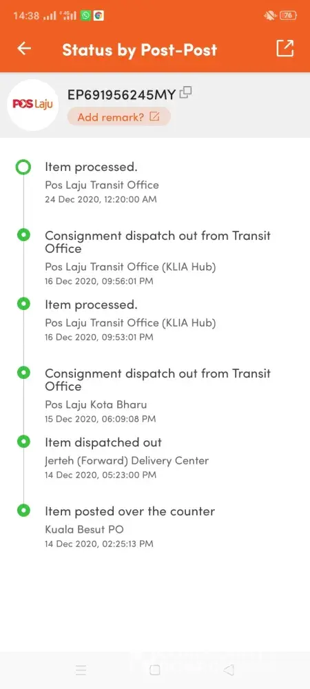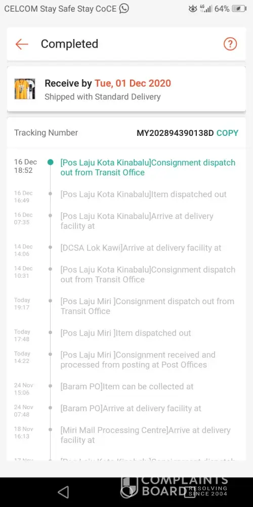 Last status by Track & Trace: 23 Nov 2020 - Item dispatched out MAIL PROCESSING CENTRE TAWAU, PO & CW Semporna.