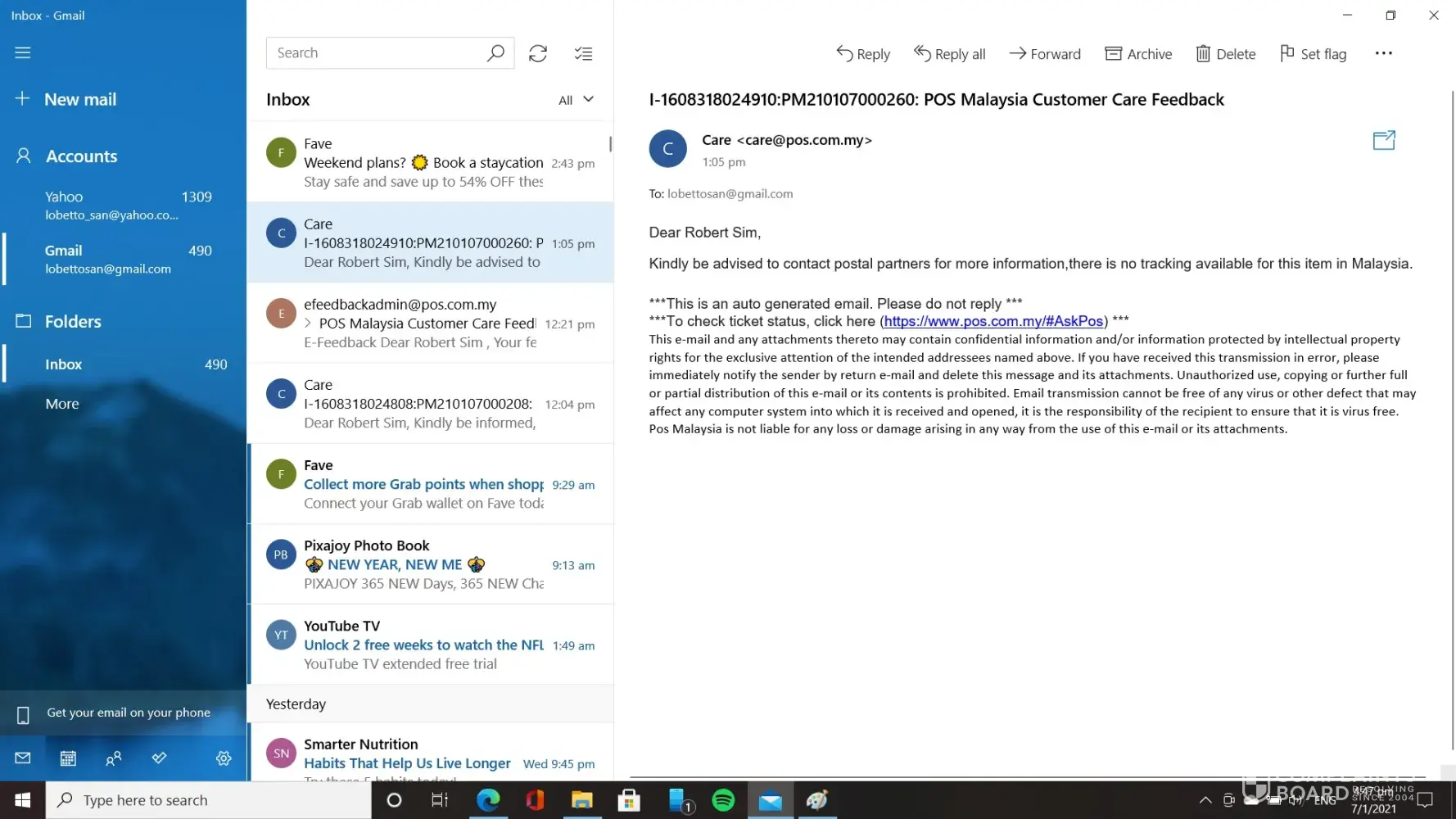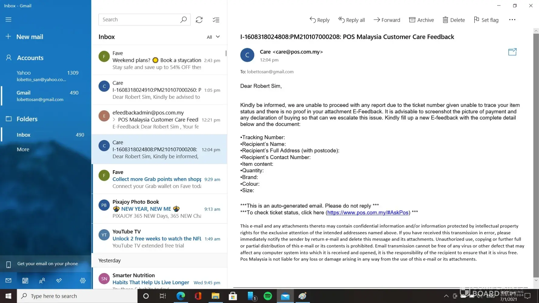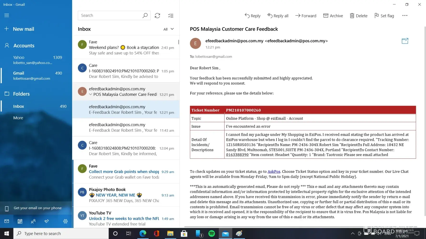 Desired outcome: Pos Malaysia should provide a dedicated help centre or customer contact agent for customer to call to follow up on their enquiry and also ensure their systems is working fine.