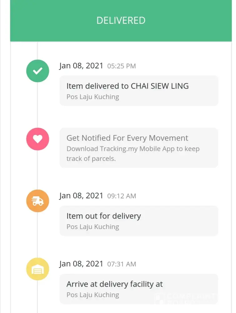Hi, I want to complaint about the parcel with tracking number erc495863163my, on the tracking page, I checked is item delivered on 8/1/2021 but I didnt received, please settle the things by today and give me back the parcel if the person in charge sent to the wrong location
