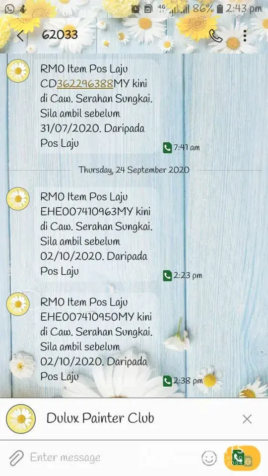 yang sudah berkali-kali tidak memasuki kawasan perumahan saya untuk menghantar barang sebaliknya hanya menghantar sms agar kami self collect di pejabat pos. Pihak pos malaysia perlu segera mengatasi masalah ini agar tidak terus berulang lagi.