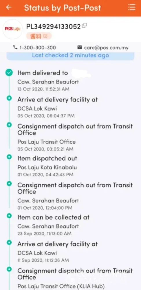 Parcel sy tidak sampai sy hantar ke pos laju pd 20 Oct @4.29pm. Tracking no EP743711894MY dan Ticket no PM20108000023
