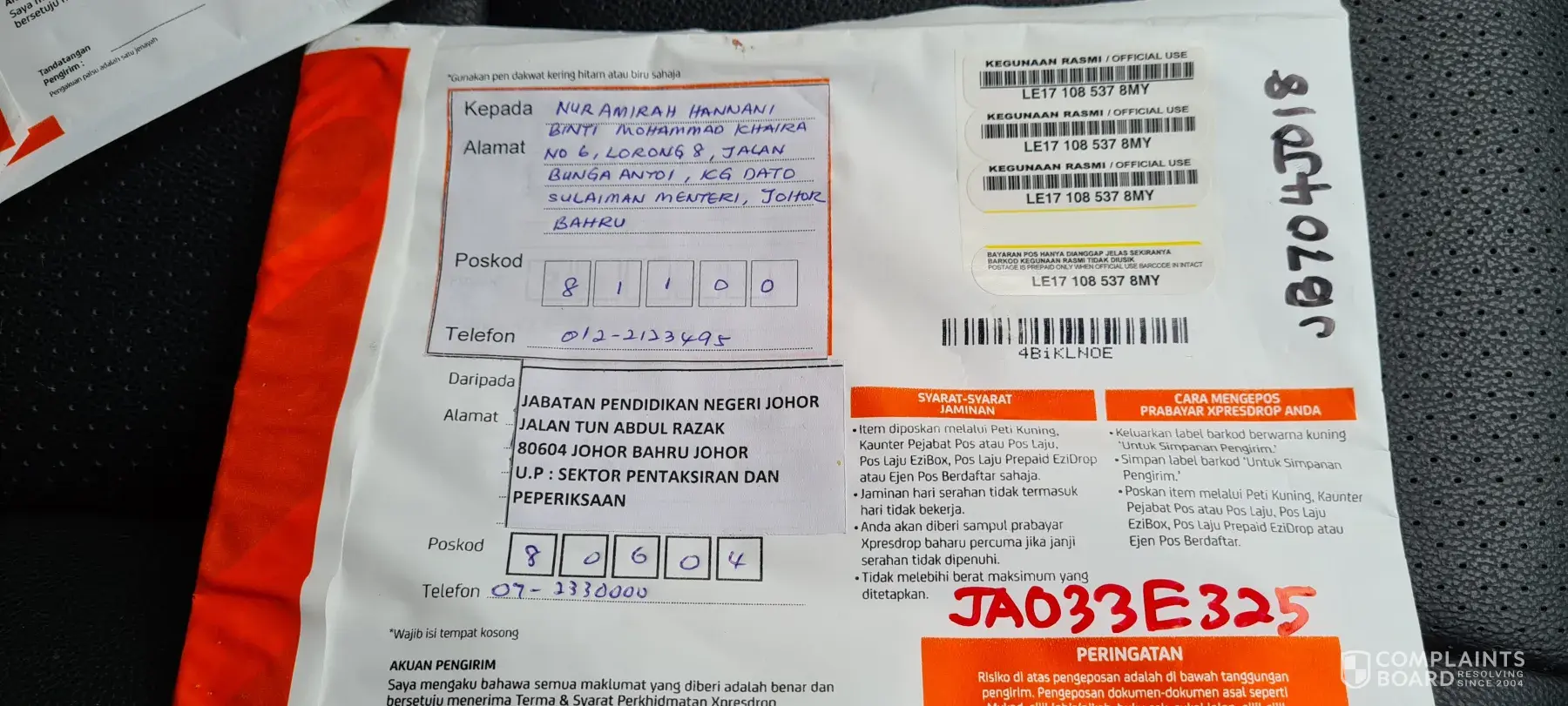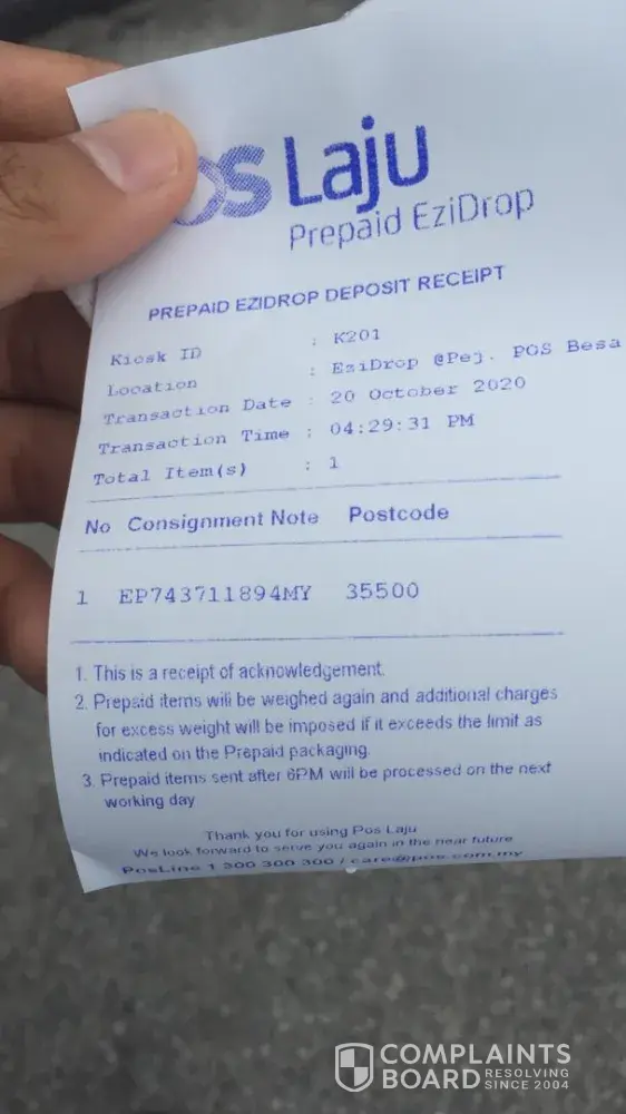 Minta jasa baik pihak tuan/puan mengatasi masalah kami, pihak kami juga sering menggunakan khidmat penghantaran lain seperti pos laju skynet, gedex dan lain-lain, namun tidak ada masalah.