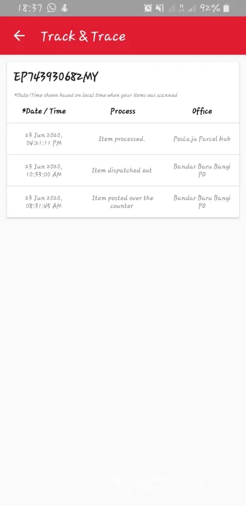 Jun 19, 2020 - Arrival at Processing Center (Country code: MY)