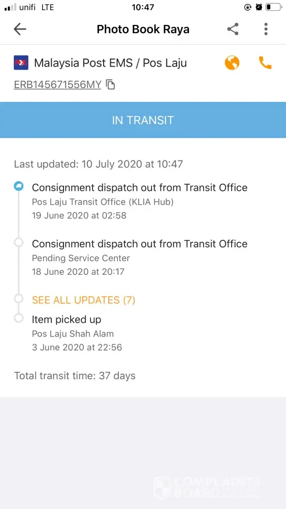 saya order barang pada 10/06/20 dan item already picked up pada tarikh yg sama. Masalahnya tracking tak update start 13/06/2020 sampai lah hari ni (07/07/2020) masih tersekat dia KLIA Hub. Hampir sebulan barang saya kena kuarantin di HUB tu. Seller pun blum dpt payment lagi. Boleh ka pihak poslaju tlg usahakan cari brg saya ni, risau kalau tercicir sebab brg yang saya order kemudian telah sampai. brg satu ni saja yg tak update-update.