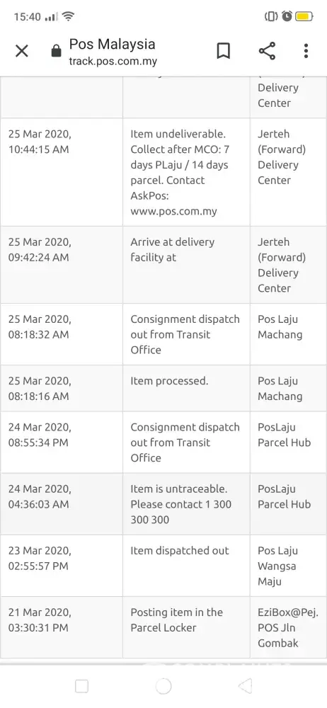 This is their tracking system 😤 everyday track still the same 😡 how can people calm down already paid and can’t received parcel so long POS LAJU no responsibility at all they don’t care how u call or complaints no answer . We had order to stay at home and work from home with this essential service provided but this really disappointed 😞