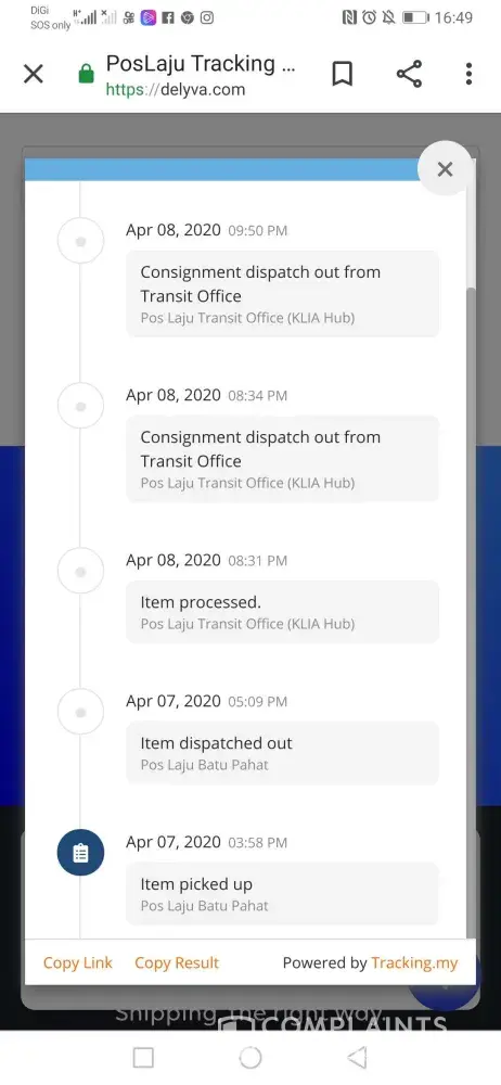 Seterusnya, item telah "posted over" ke kaunter pada 6.4.2020. Kemaskini terakhir ialah pada 7.4.2020 menyatakan bahawa item sedang diproses. Dan sehingga hari ini tiada sebarang update dari pihak poslaju.