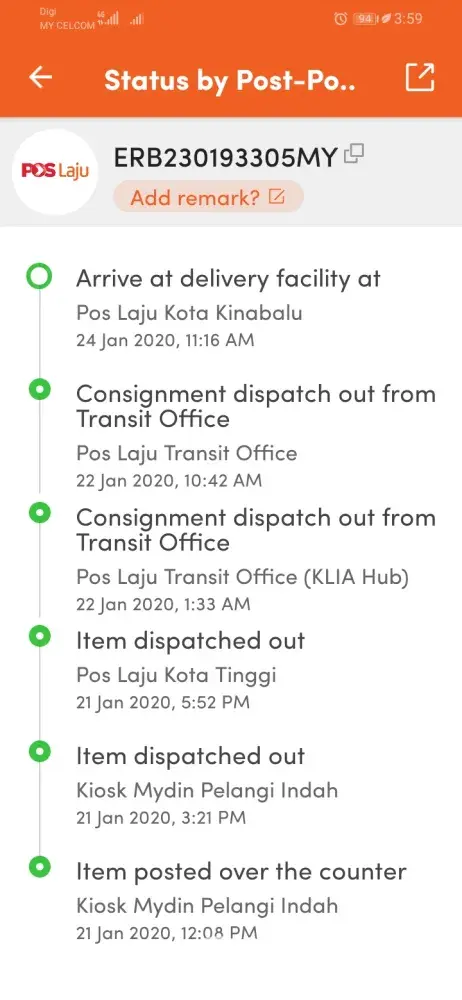 Selamat petang. Encik/cik Item saya belum sampai di destinasinya nombor tracking ERB230193305MY dari tarikh 24 Jan 2020 dah 3 minggu sudah item belum hantar dari pos laju kota kinabalu. Saya sudah check pos laju yang sepatut sampai kat pos laju Tamparuli, saya sudah tanya kat pos dia bilang barang masi belum sampai lagi. dah 3 minggu sudah betul-betul lambat hantar.