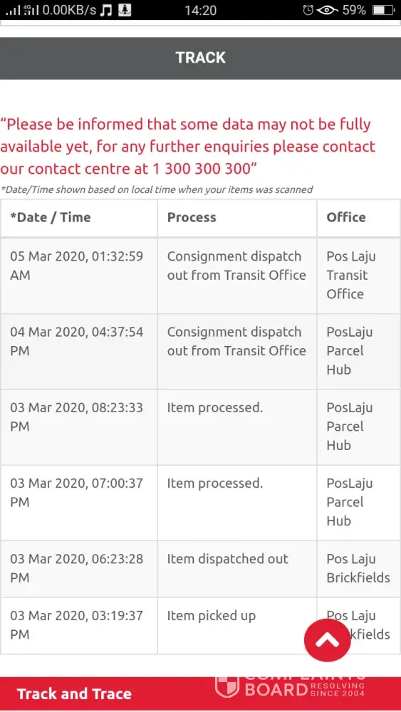 07 Mar 2020, 10:19:04 PM Item processed. Pos Laju Transit Office (KLIA Hub)
