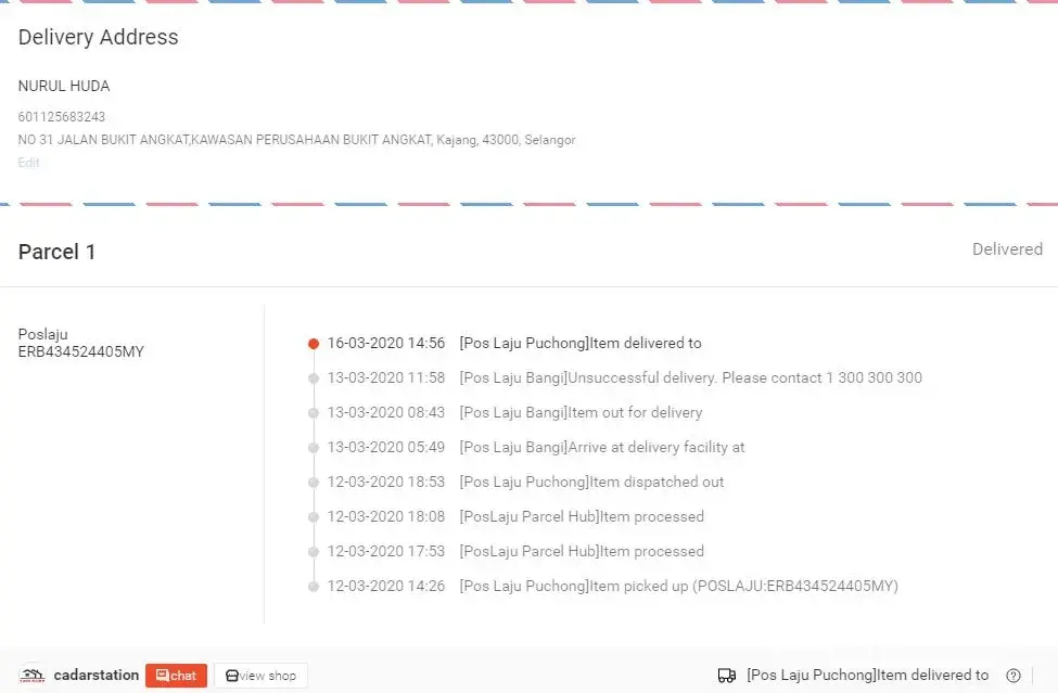 07 Mar 2020, 04:45:40 PM Item dispatched out Pos Laju Muar