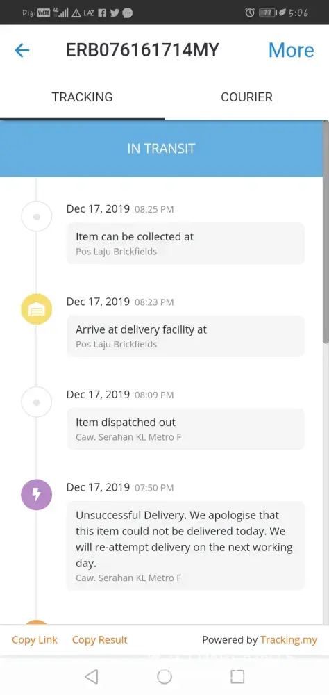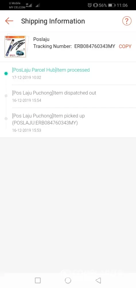 12.2019 status still dispatch out from batu pahat . Tracking no ERB084525402MY. PLEASE CHECK MY ITEM! ALMOST 10 DAYS DISPATCH OUT AND NO MOVEMENT. I WANT REFUND IF MY ITEMNOT RECEIVED! I CALL POSLAJU BATU PAHAT SOANY TIMES NOT ANSWER! BAD SERVICE! PLEASE SETTLED IT. I WANT MY ITEM