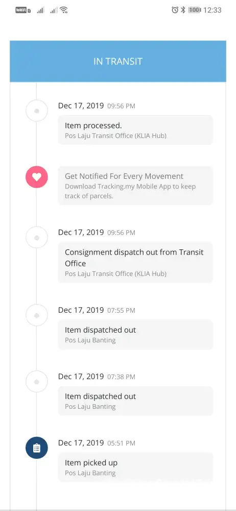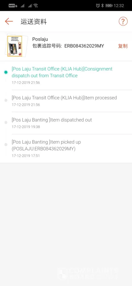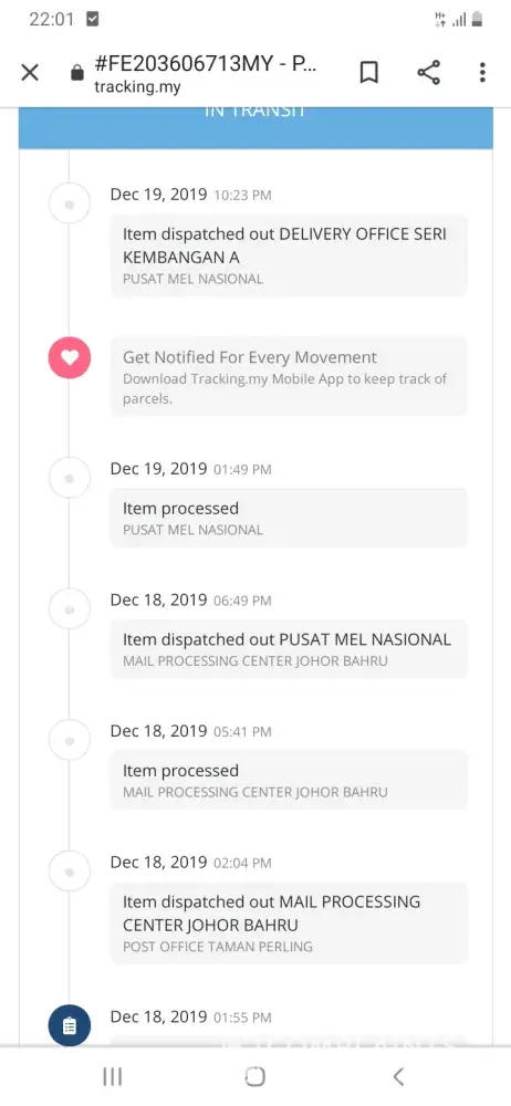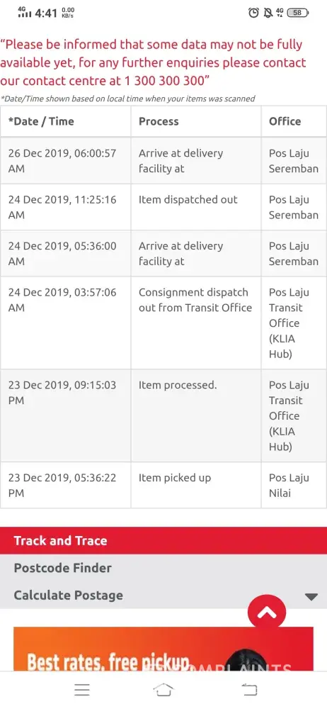 Saya ingin membuat aduan barang saya yg telah di pos pada 17 Dis dan telah sampai di poslaju Seremban pada 18 Dis 2019 pagi.