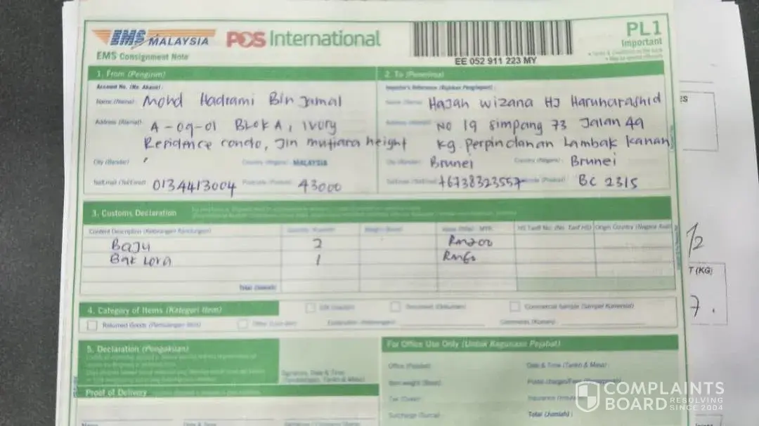 Assalamualaikum and good morning. I want to complain about my postage that I send on 1/11/2019 to brunei. I paid the postage about 1+,. But today is 12/11/2019. Before this I send the items to brunei for 5 working days only for rm80. Now the items still in shah alam pos laju. The staff also said ut will be received 3 to 5 daya. Please do your work or at least inform your costumer why you hold the items. Because we paid to you the service and its not free. Thanks and regards