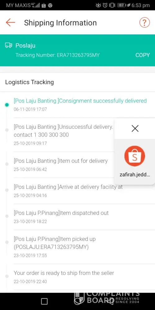 15/11/19 i wan to complain about my parcel was broken when delivered to my customer. This parcel inside is Anmyna Silky Shampoo. This tracking number is ERA746812407MY