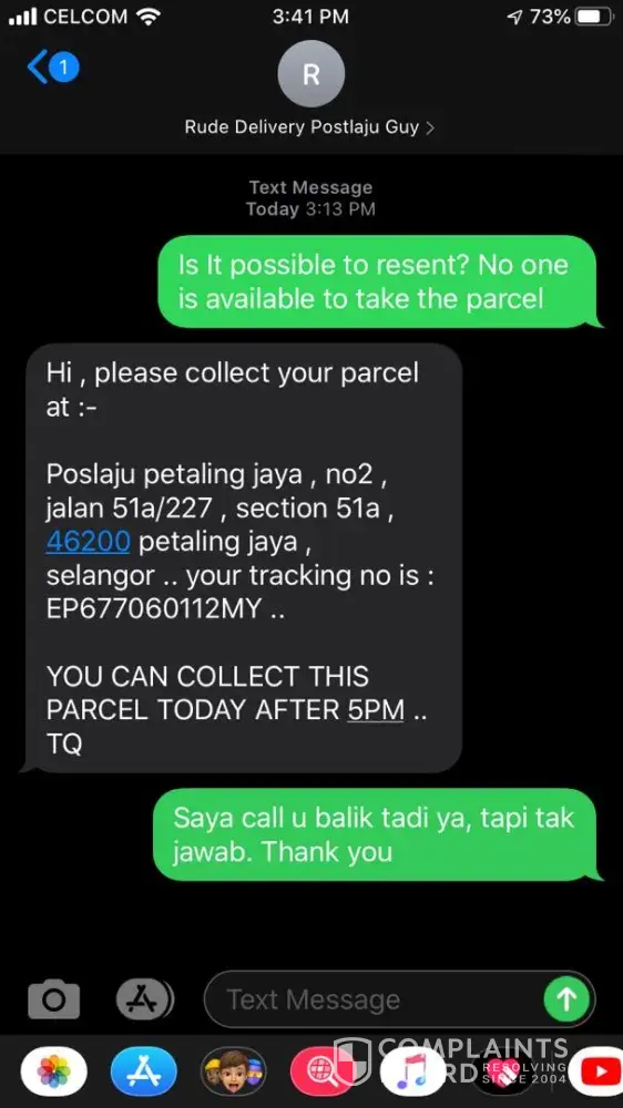Today 13 of November 2019 at 3:10pm, a delivery guy called me to take my parcel however I am not home and either is my roommates. So i called him back but he did not answer me. Respectfully i texted him that no one is home and if is there any way to request to resend although i doubt it and waited for him to call me back, being mindful that he might be attending other customers. I did not want to make this guy's job worse so i didn't want to cause anything. While i waited, he called me again 30 mins later, asking if anyone is going to help me take my parcel, and i told him no because no one is available and there he went shouting at me that why didn't i called him back. as he was waiting for me for so long. I did call him back, but he kept on telling me i didnt call him back, saying "kenape tak call back, kenape tak call my number" he repeated over and over again and i calmly said i did. The worse part was he kept signing at me and being rude and hanged up on me. I am a very patient person but this attitude is just unacceptable. I am fully aware that if he aren't able to resend the parcel back, he culd just send it to post laju and i could collect it from there but there is ways to resolve this. and not being rude and impolite. So after he hanged up on the phone call, he straight away send me the text that says to take the parcel in post laju.