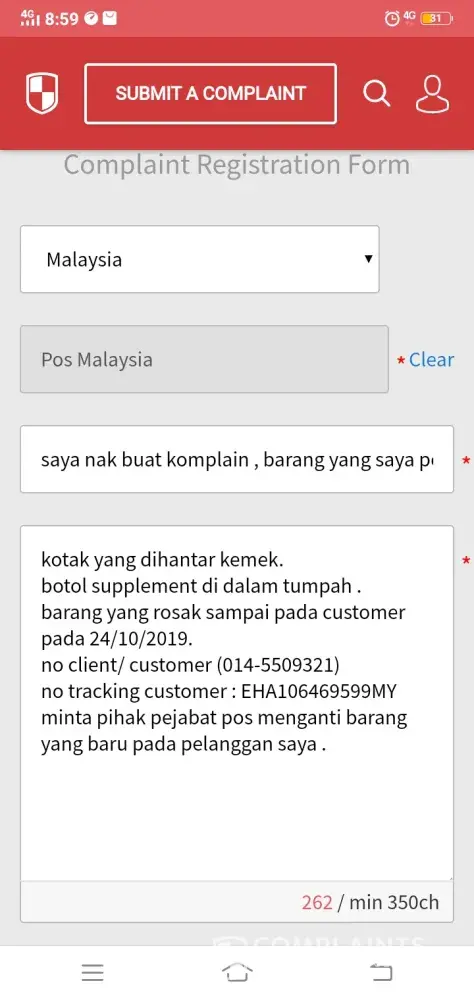 Barang dihantar pada customer pada 17/10/2019 dan sampai pada customer pada 24/10/2019, tetapi customer menerima barang dalam keadaan kotak yang kemek dan isi botol di dalamnya tertumpah sedangkan sudah dibalut dengan baik dan botol bukannya botol kaca botol plastik . saya ingin meminta pihak pos menggantikan barang yang baru pada customer saya sebab saya pos dalam keadaan yang baik minta segera amik tindakan . number customer [protected] dan no tracking client ( EHA106469599MY)