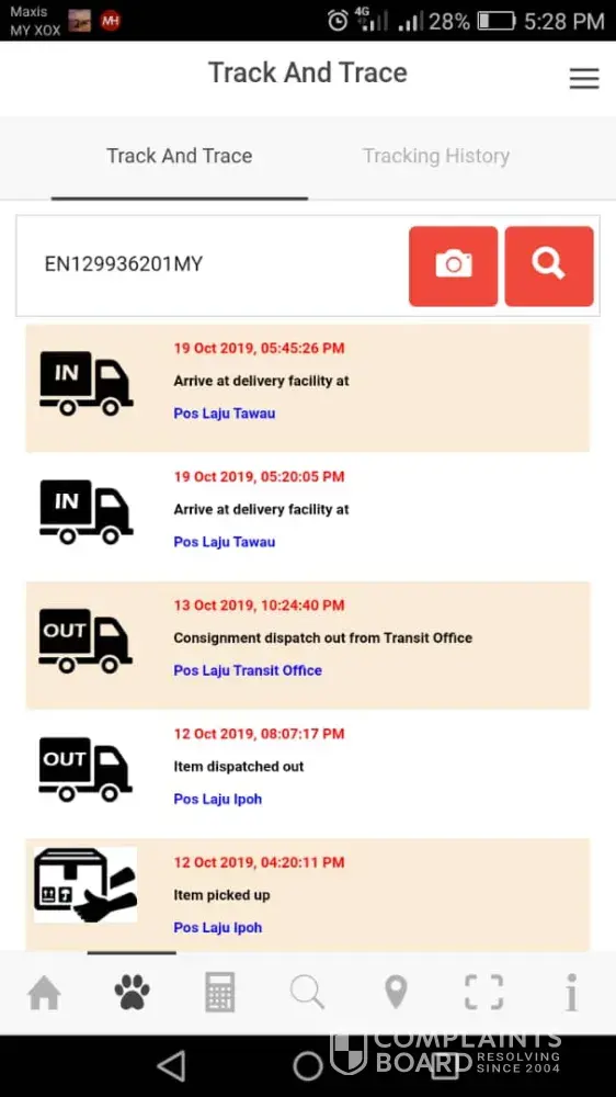 Saya nak buat aduan mengenai barang saya. Barang pelanggan saya telah dipos pada 21hb Oktober 2019. Tapi tidak sampai ke tangan saya sampai sekarang (28hb oktober 2019). Bila disemak no tracking dapat jawapan 'NOT FOUND'. HARAP DSELESAIKAN SECEPATNYA. DAN PARCEL SAYA SELAMAT DIBERIKAN KEPADA SAYA. SEBAB BARANG PELANGGAN HILANG TAKDE SIAPA NAK GANTI. THANKYOU.