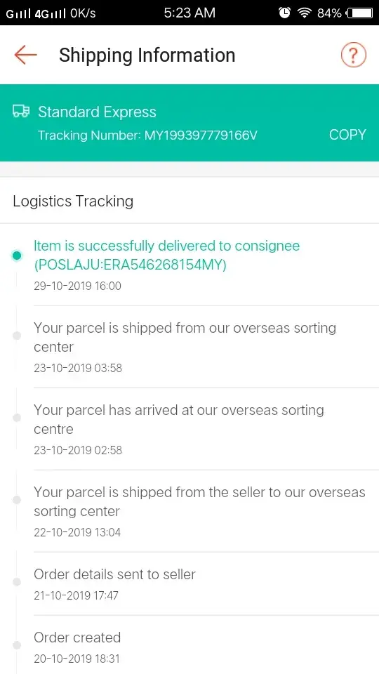 Parcel Tracking No: ERA711375388MY.
