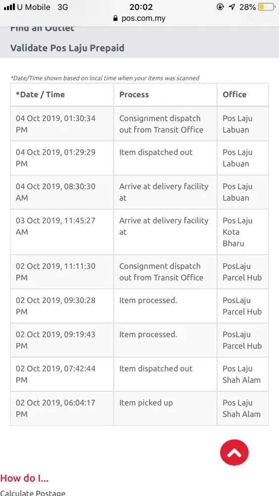 I ada beli barang online from Shah Alam pada 2/10/19 n biasanya akan sampai pada alamat yang diberikan iaitu MRSM PENGKALAN CHEPA, KOTA BHARU KELANTAN, but malangnya apabila I buat tracking barang tu already dekat Pos Labuan 4/10/19 jam 8.30 am sedangkan pada 3/10/2019 jam 11.45 am barang itu sudah sampai di Pos Laju Kota Bharu..How benda ini boleh berlaku..Mohon kerjasama pihak pos laju untuk menyiasat perkara ini dan harga barangan itu sangat bernilai untuk saya..Disertakan bukti tracking utk makluman.Sekian terima kasih.