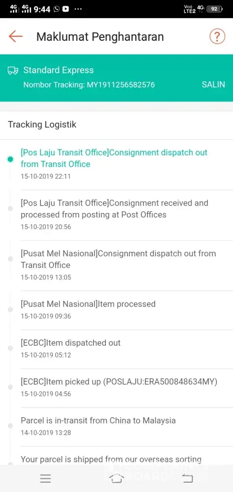 saya mahu buat aduan brg yg saya beli dari shopee smpai skrg saya blum trima. dari tracking logistik saya ambil tarikh 15.10 time 04.56 pnya tracking (ECBC)item picked up (POSLAJU: ERA500848634MY) masi pending smpai skrg. yg trakhir tarikh 15.10 tracking logistik detail consignment dispatch out from transit office time 22.11. tapi smpai skrg 22hb hampir 1 minggu saya belum trima lgi brg saya. cek tracking logistik shopee masi stuck 15hb. saya ingin cek guna pos laju tracking masalah pula under maintenance. kepada pos laju malaysia tlg atasi prmasalahan saya ini.