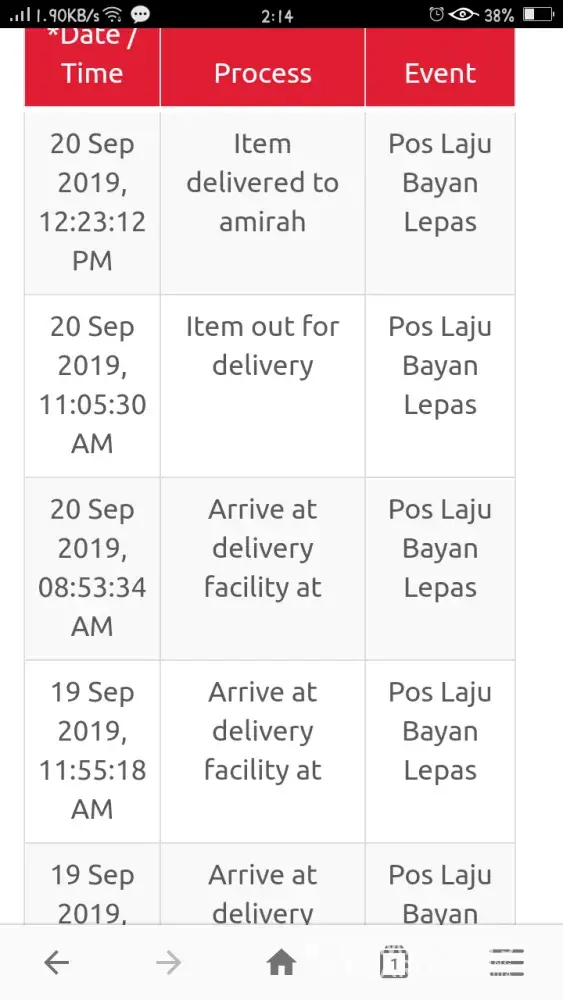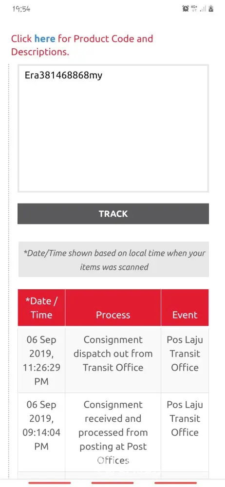 Barang pos laju ERA479968797MY sehingga hari ini belum saya terima. Last saya pergi ke pejabat poslaju pada 13/9/19 staff bagitau barang saya belum diproses..sedangkan item dah arrived di poslaju bintulu pada 11/9/19..bila saya try trace lagi dlm sistem tracking poslaju pada malam 14/9/19 saya terkejut kerana brg saya sudah diterima tetapi atas nama orang lain dan bukan penghuni alamat yang terdapat dalam barang yg dikirim tersebut. Jadi saya nak tahu ke mana dan dimana barang saya dihantar oleh posmen poslaju btu..try call poslaju tapi tak pernah dapat...sangat2 kecewa dengan perkhidmatan poslaju..