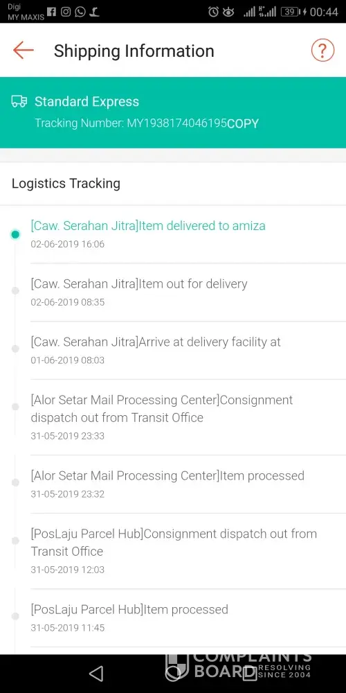 Still not receive this parcel since 22 May 2019 from Jerteh. There was no record in system after out from Jerteh.