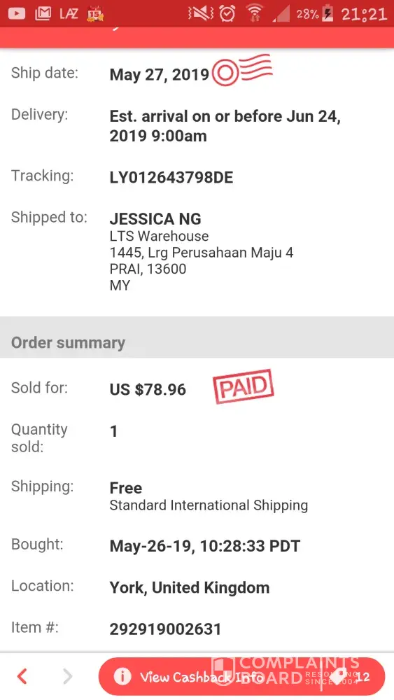 I have another package, tracking no. Ly012643798de also put destination address to lts warehouse. Please please keep it for me, send me a message if you cannot reach me. As I know many people's job also cannot keep their mobile with them. Please be considerate. We also pay poslaju/pos malaysia the delivery fee. Last time if poslaju cant reach us/item not delivered, will give us a message and keep for few day, somemore just local delivery. While my package this time from hk and somemore expensive item, why so fast already sent the package back to hk?