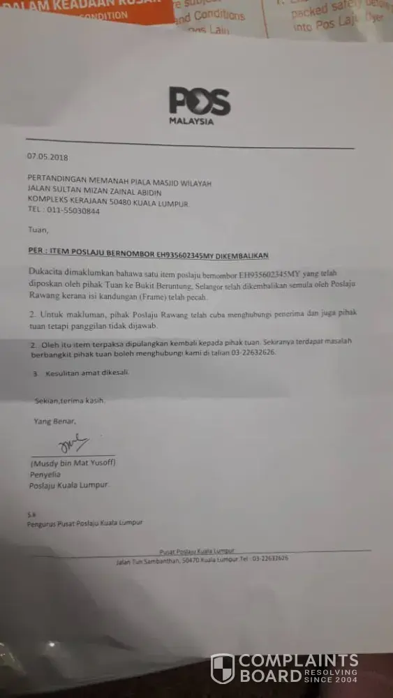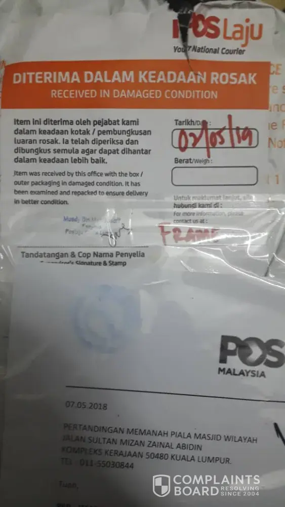 pihak kami telah pos bungkusan (frame sijil) berbentuk kaca dalam keadaan yang baik kepada penerima pada 29 mac 2019 di pos laju catu caves. Dan kami telah mendapat panggilan daripada pos laju untuk mengambil kembali bungkusan tersebut di pos Laju kuala lumpur, oleh kerana pihak Pos Laju telah cuma menghubungi penerima, tetapi tiada balasan daripada penerima. sehubungan itu, pihak kami telah menerima kembali bungkusan tersebut didalam keadaan rosak (pecah), tetapi pihak pos laju sertakan sekali memo dan surat bertarikh 2 MEI 2019, memaklumkan mereka telah menerima barang yang rosak dari Pos Laju Rawang, sedangkan pihak kami poskan didalam keadaan yang baik.