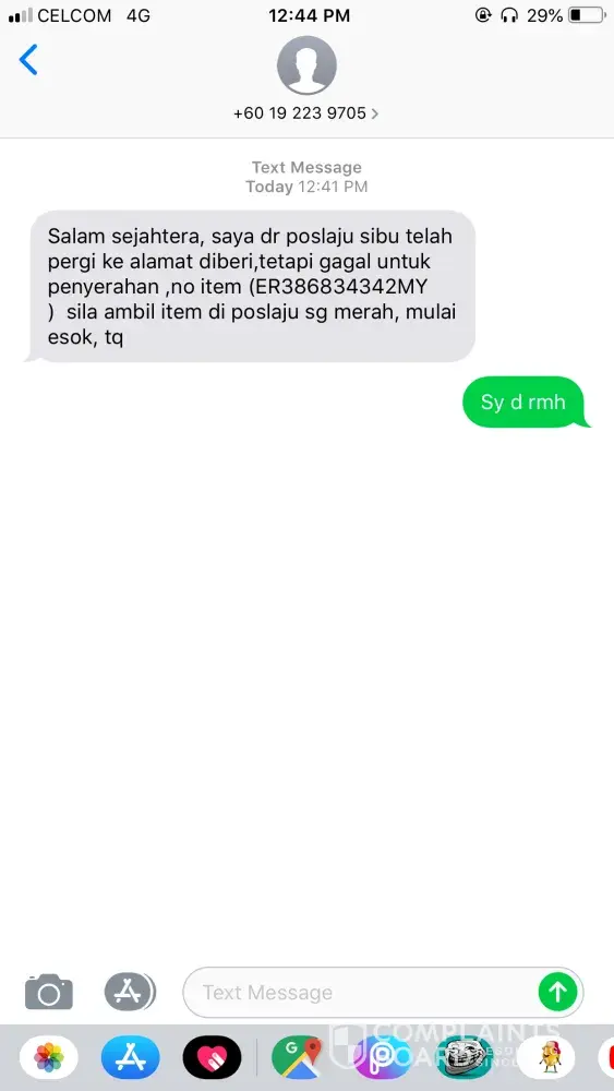 I was received this text from your employees as they supposed to hand in my item today Wednesday (26/12/2018) at Sukun, Sibu area around 12:41pm. They telling me I am not at home so they asked me to pick up the item at your branch in Sg Merah. For the record, I am at home that day while receive their text. they not even horn their vehicle while at outside like they suppose to do everytimes they hand in the items. Now, there must be a lesson for your employees attitude.
