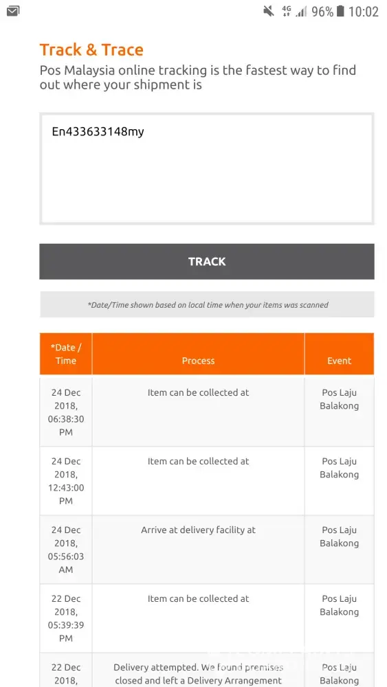 Based on the track n trace, item has arrived at poslaju balakong on 17/12/2018 from penang. Unfortunately after 6 days keep the item, poslaju balakong has updated in the system delivery failed on 22/12 and simply drop the notice sheet in my post box. Actually, i am at home during that time and furthermore no door bell ringing and phone calls made to me. Very frustated.