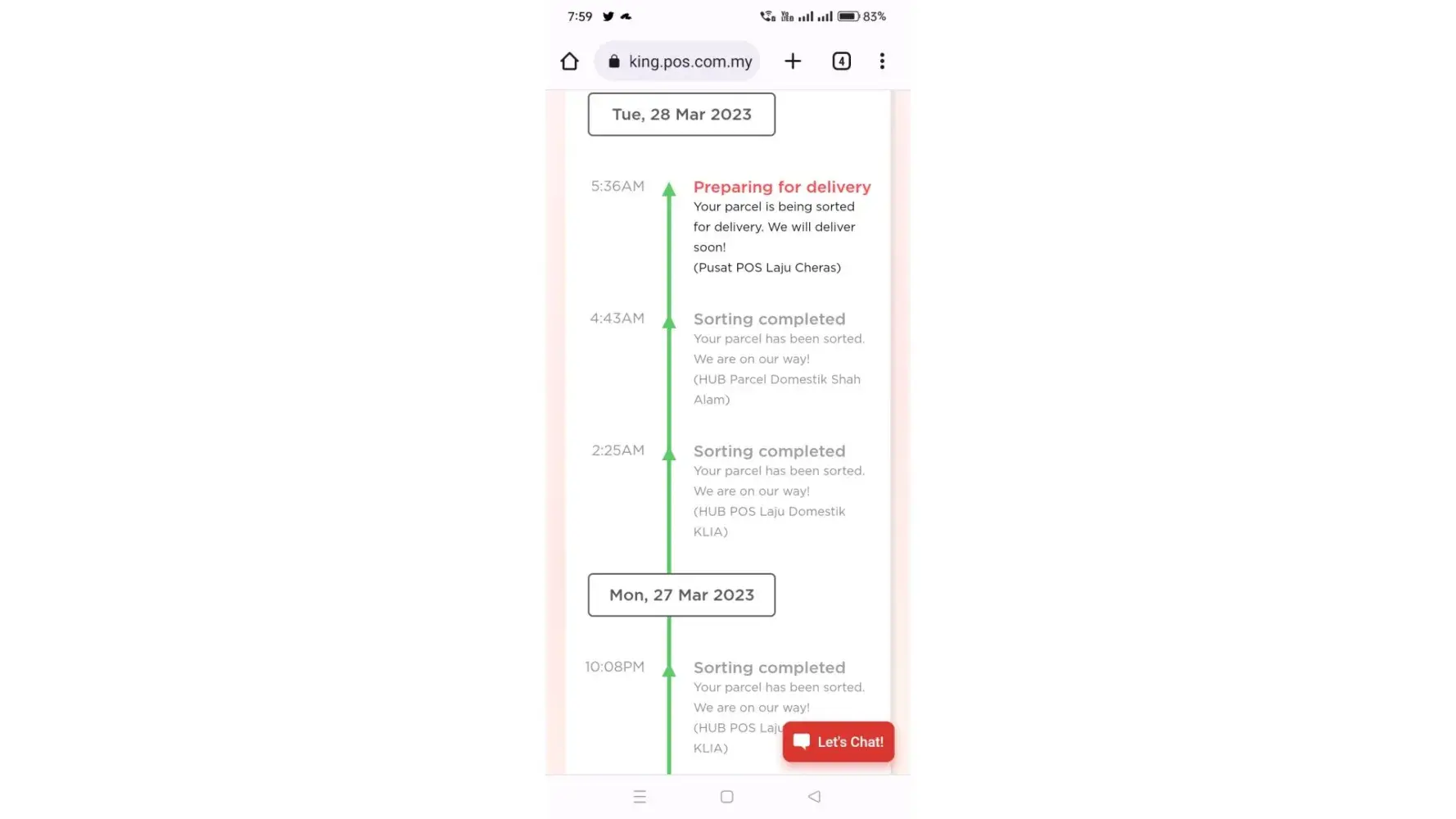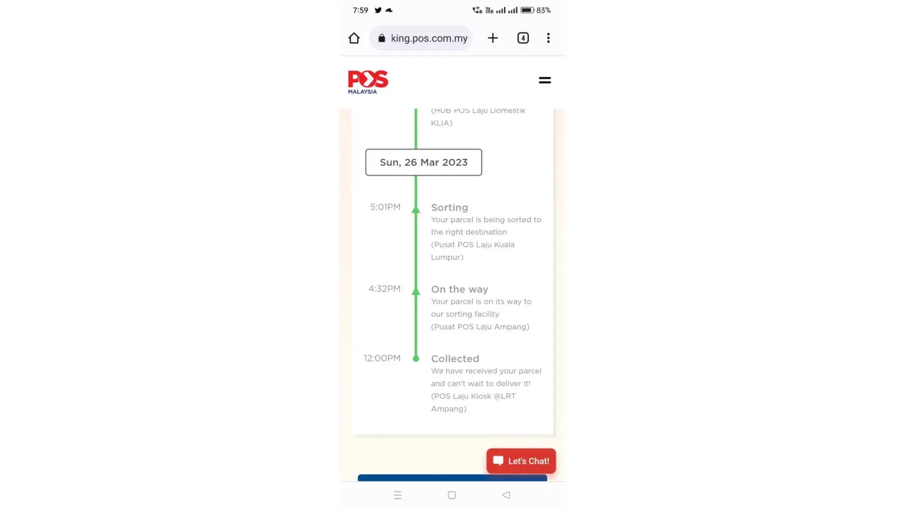 I sent my parcel with the above tracking number from POS office Ampang train station, when I check the parcel still in Cheras pos office