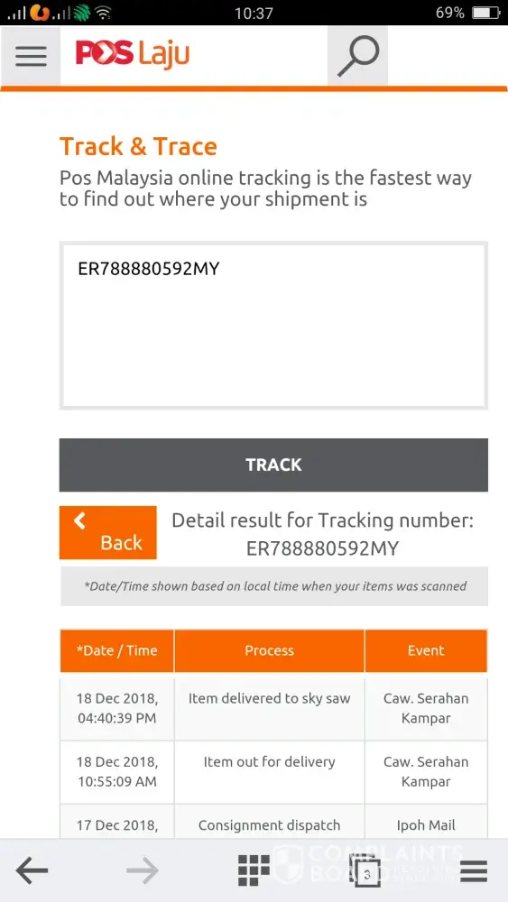 For postlaju kampar, My track my parcel (ER788880592MY) and the results show that yesterday (18/12/2018) had delivered the parcel. But didn't received any parcel yesterday, I think postman send to wrong house, may I know what happen is going on? Where is my parcel? Postman last time also deliver my parcel to wrong address ! Kindly solve my problems as soon as possible!