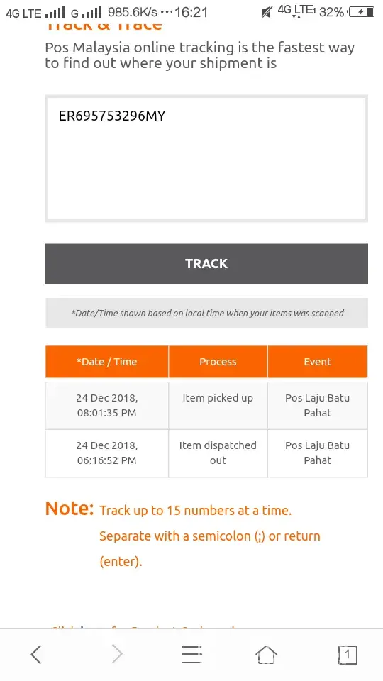 I also have another courier from another source has arrived to Poslaju Jitra on saturday 24 Nov 2018 and I went there in order to receive it, the postman there has checked my coureir and it was arrived at there location already on that day but he refused to give it to me because he said; it must be scanned first, and he informed me to wait until next day (Sunday 25 Nov 2018) and it will be delivered to me, but it did not delivered to me as his information.