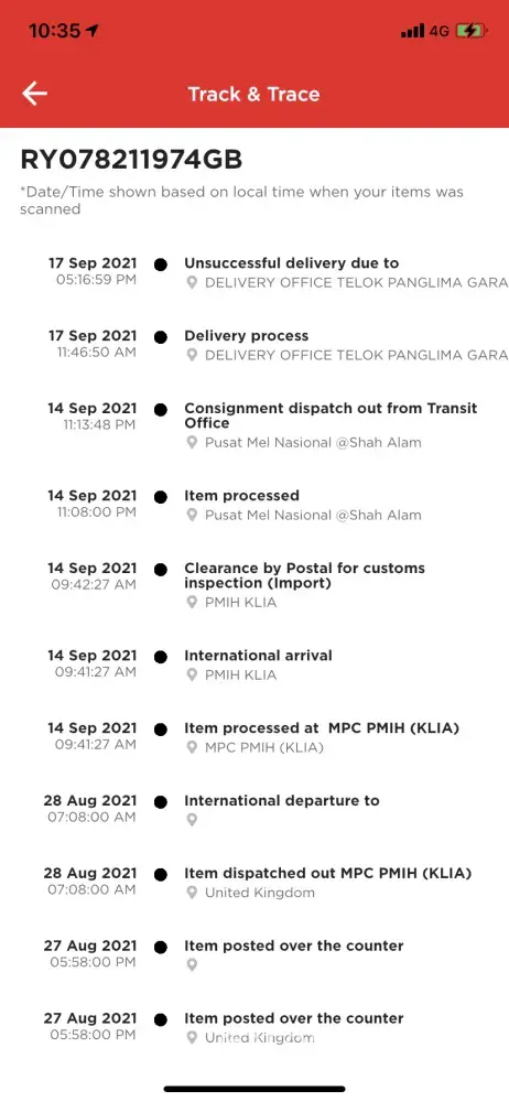 I did my parcel from Kuching with consignment number CD351976075MY to Labuan on 13.9.2021
