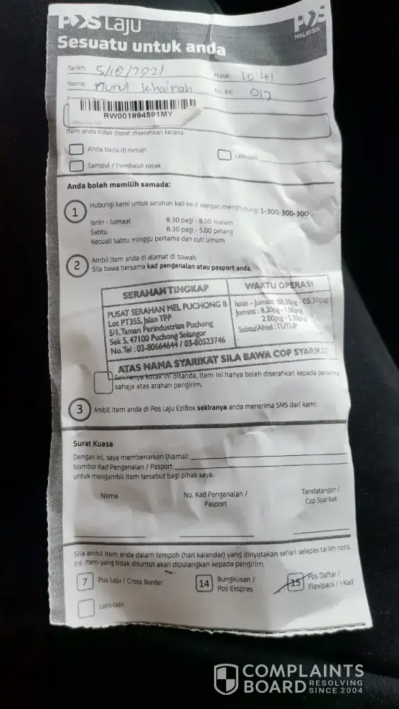 My parcel was posted on 9 sept supposed to be delivered to ezibox locker poslaju skudai but I was asked to collect from the post office but then by the time I finish my work the post office will be closed can't expect me to take leave just to collect my parcel. (ep831275421my)