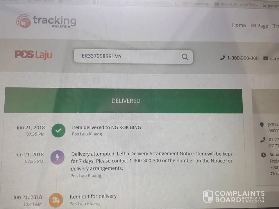 i bought a hardish in shopee on June. I checked from online tracking number system found that the parcel was already signed by me on 21 June but problem is i did not received it ever! I am very disappointed and helpless throughout this service! My tracking number is ER337958561MY. My name is Ng Kok Bing and my poslaju outlet is kluang, johor. I already went to customer service of kluang poslaju office. The officer told me to wait, he need to ask the postman first. But 3 days already passed, i haven't received any call from the office. I hope this problem can be solved and adjustments should be make within the company to prevent this type of problem occur again and again! This will make people lose trust in POS LAJU!