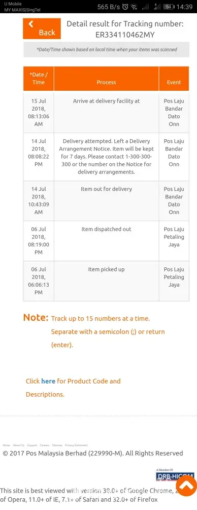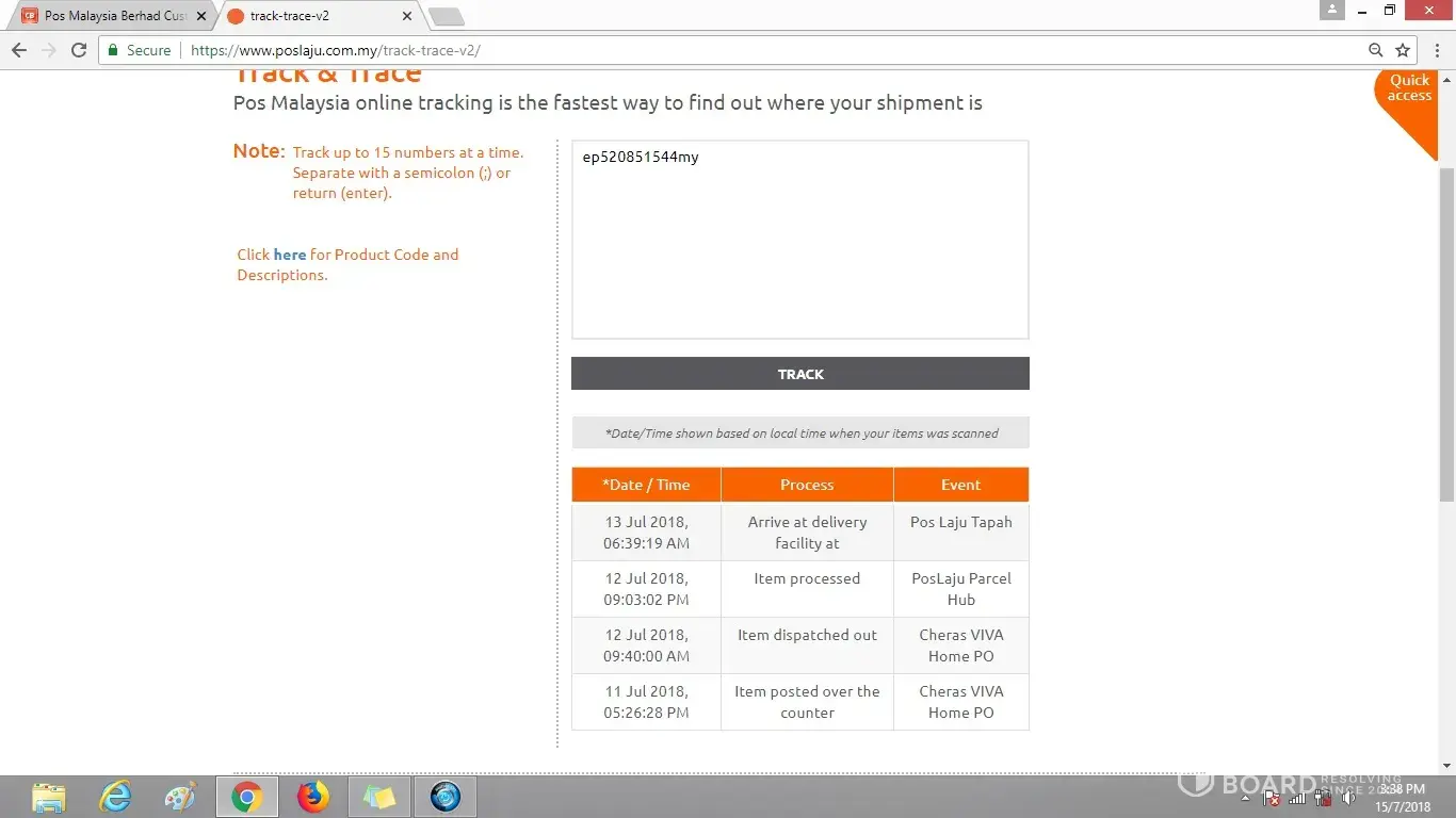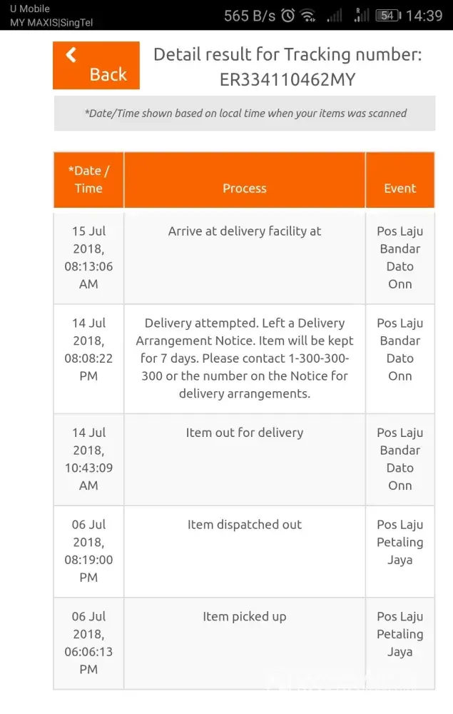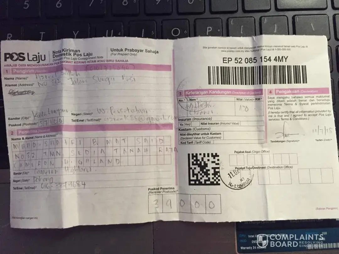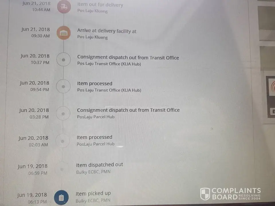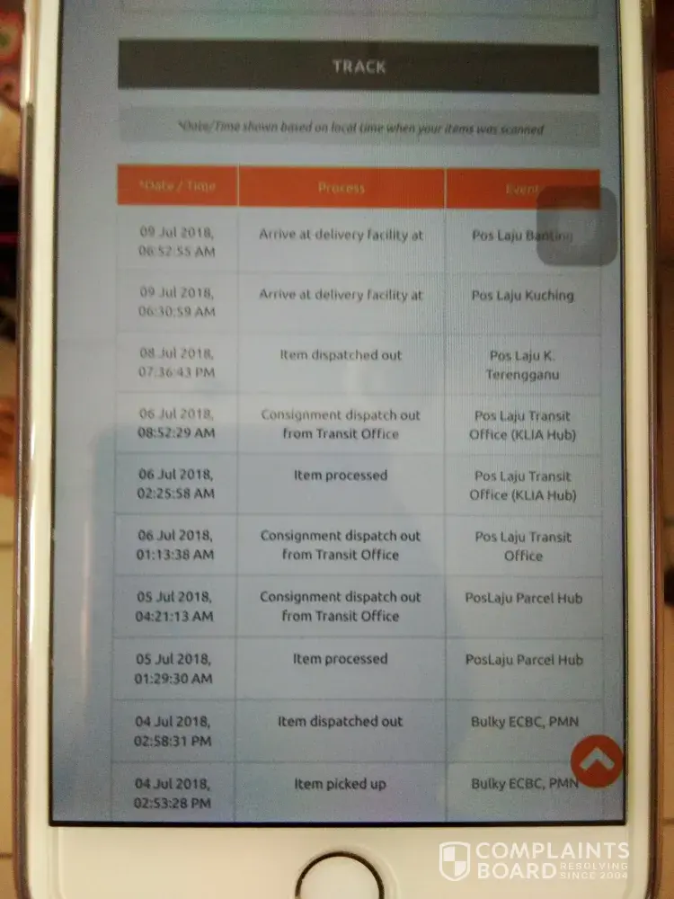was sent out on 8 Jul 2018 and arrived at pos laju kota bahru counter on 8 july 2018, 8.06pm.