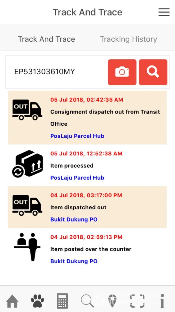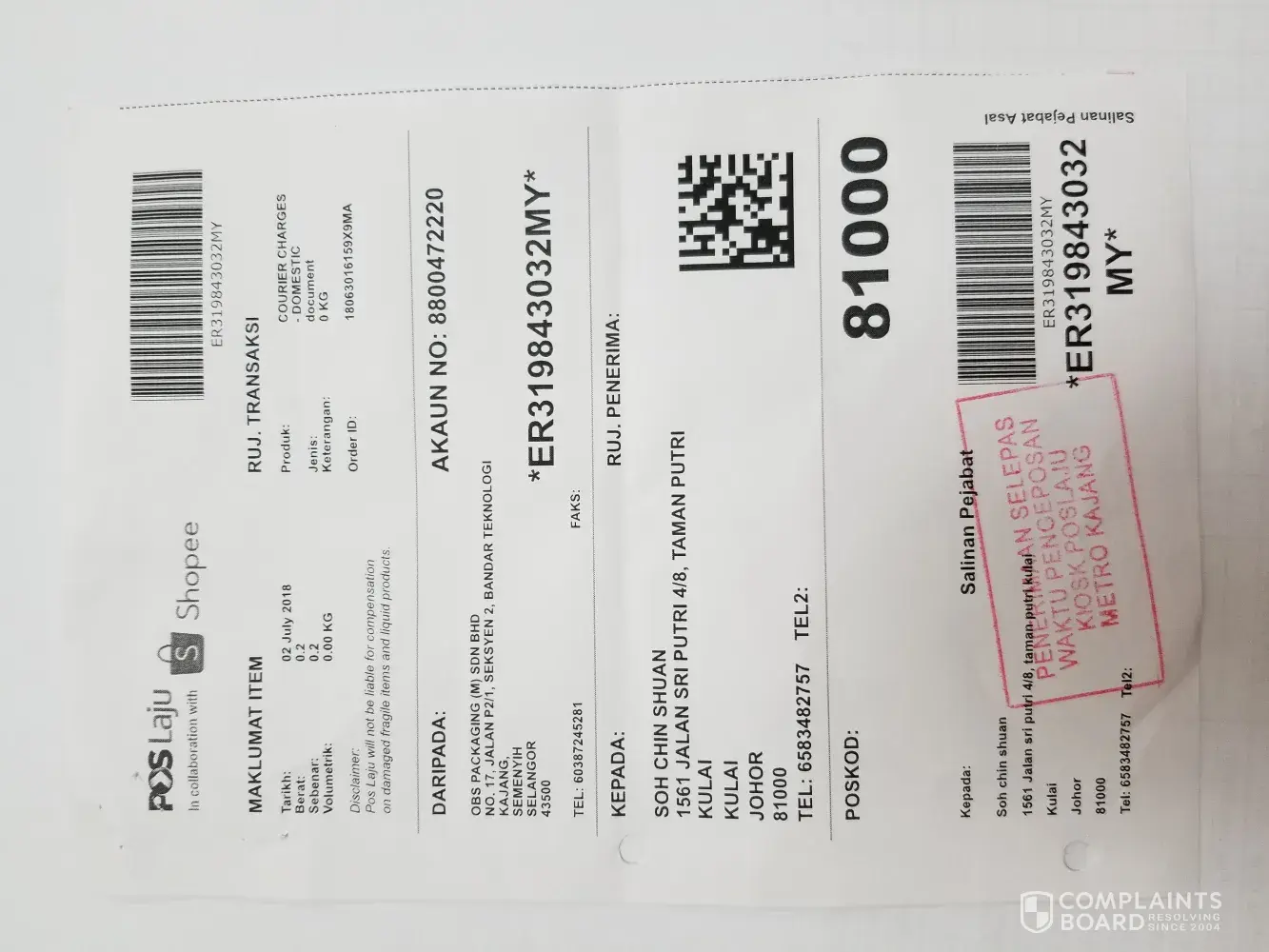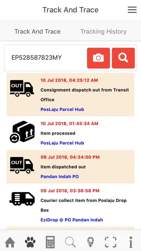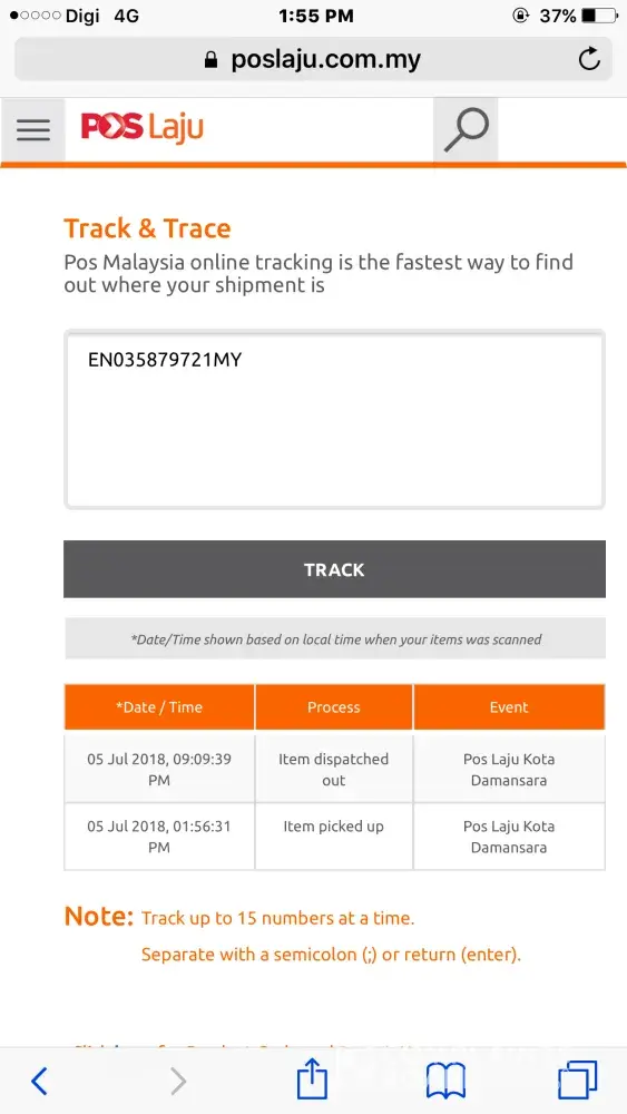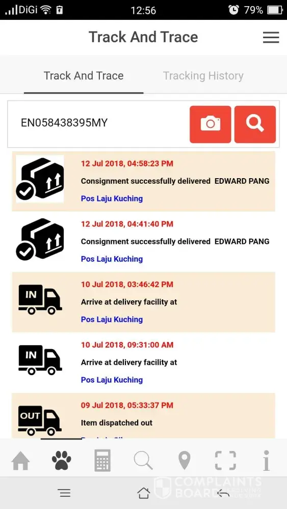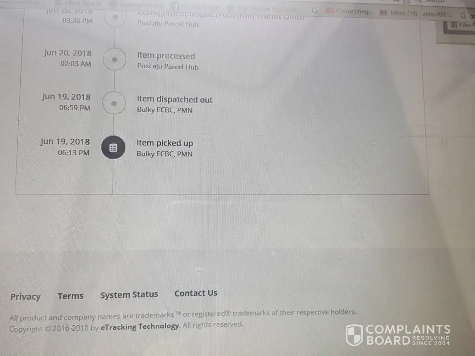 was sent out on 8 Jul 2018 and arrived at pos laju kota bahru counter on 8 july 2018, 8.06pm.