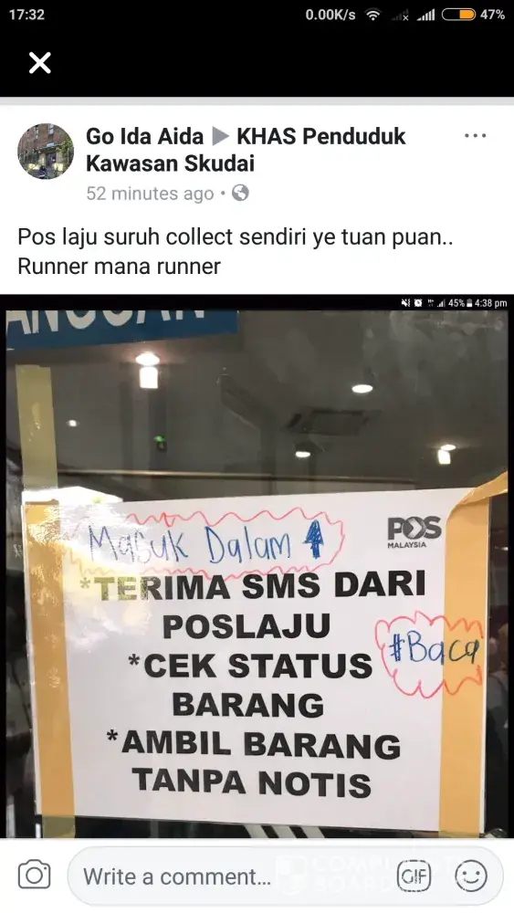 Hai.. sye nak buat aduan ya .. item tidak dapat diserahkan pada 6/7/2018 disebabkan poslaju tidak sempat.. ok its not my problem.. then mereka membuat penghantaran semula pada 10/7/2018 pada waktu pagi.. tapi tak berjaya kerana tiada orang dirumah .. pada waktu petang item sudah di pos ke puchong? Dan semalam saya baru dapat sms dari poslaju untuk ambik item sebelum atau pada 17/7/2018. Bila saya call untuk penghantaran semula mereka kata barang sudah tiada? Kerana lebih tempoh? Ape ni? Macam mana handle barang customer? Penghantar langsung tidak menerima item yang dikatakan dipulangkan kepada pengirim.. jika item hilang.. saya mahu poslaju bertanggungkawab.. atau saya akan membuat laporan / saman ke atas poslaju