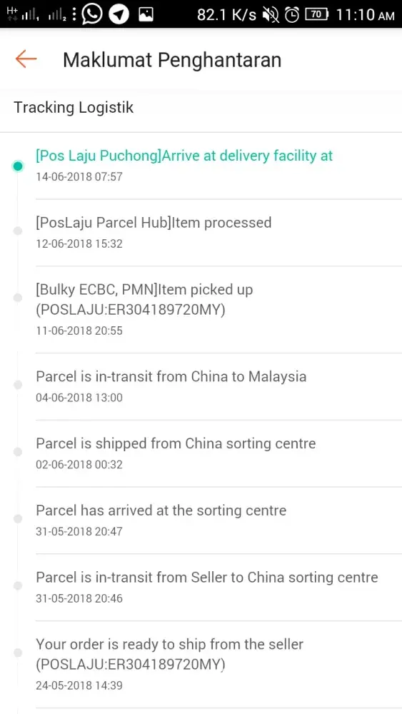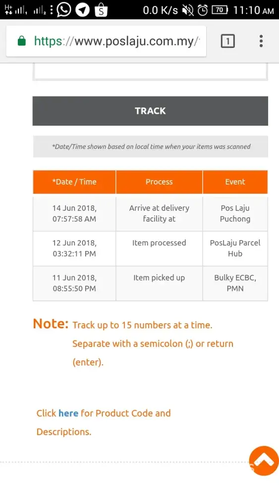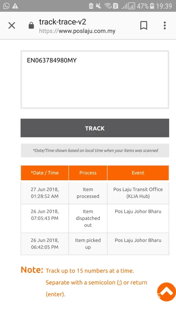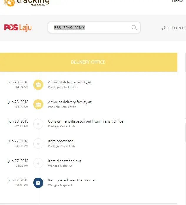 Tracking online status stucked at "arrive at facility Pos Laju Batu Caves".