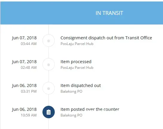 Tarikh pengeposan adalah pada 6 Jun 2018, sekarang dah 12 Jun 2018 tapi barang customer masih juga belum sampai. Bila trace barang masih "IN TRANSIT" dari 7 Jun 2018 sampai sekarang.